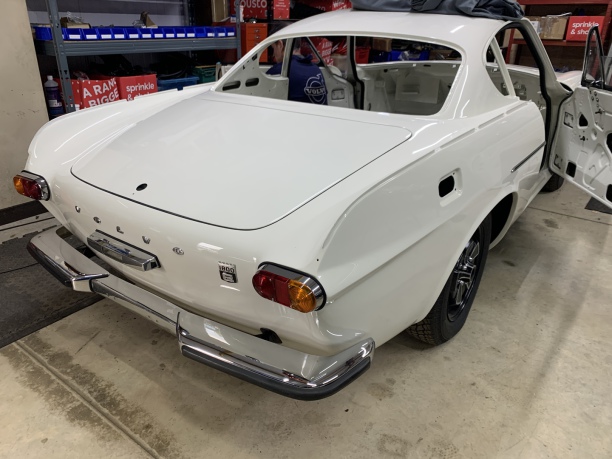 The 1963 P1800S back from the paintshop for fit up. Chrome on first and interior due in sometime in May.
